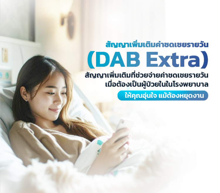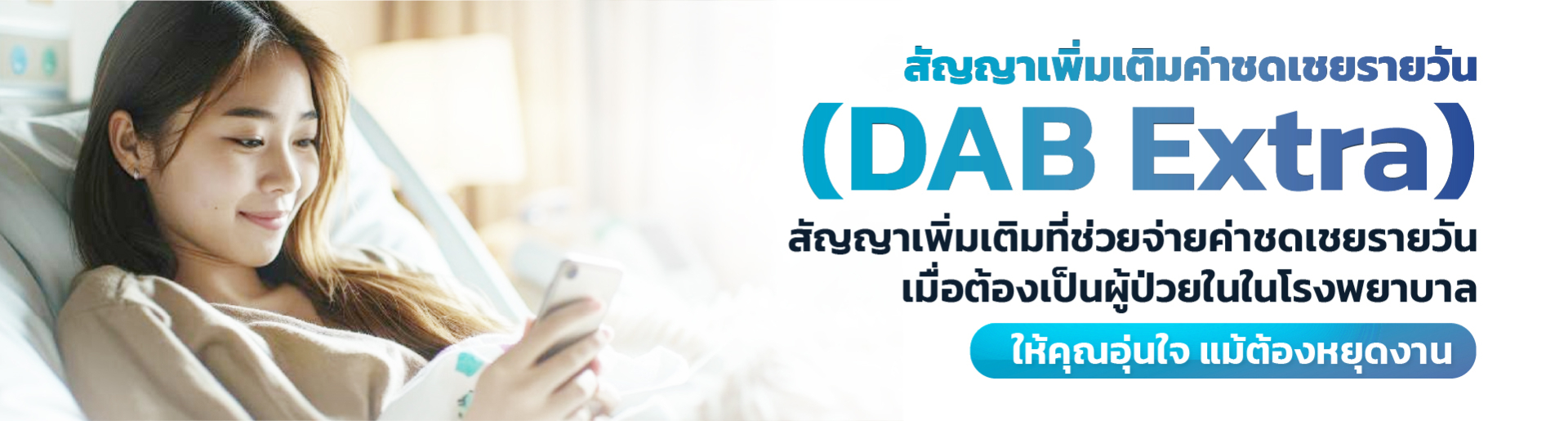 *In the case of choosing the DAB Extra coverage plan with a daily benefit of 4,500 baht for the insured aged 16 to 64 years, and having a total sum insured of the main policy in ordinary type from all active policies of 1,000,000 baht or more.