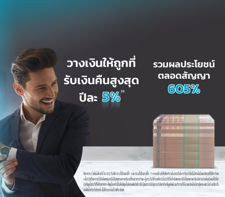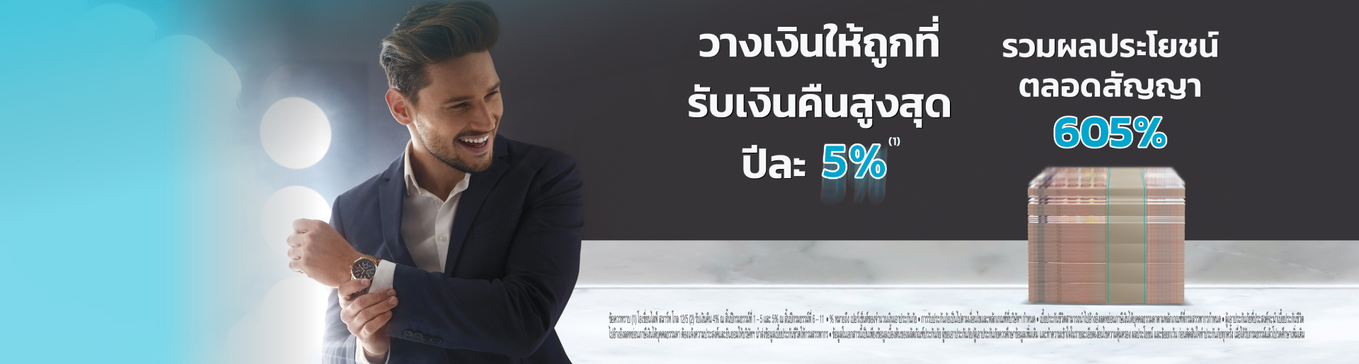 - ณ วันครบรอบปีกรมธรรม์ที่ 6-11 รับเงินคืนทุกปี ปีละ 5%