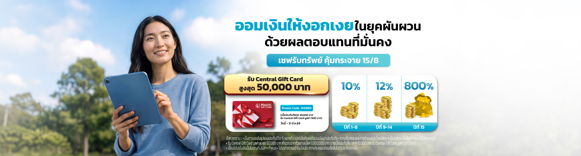 - ทำประกันเบี้ยฯ ทุกๆ 10,000 บาท รับ Central Gift Card มูลค่า 500 บาท